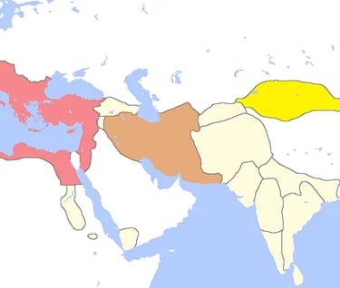 Mapa Eurazji przedstawiająca Imperium Rzymskie oraz Cesarstwo Chińskie dynastii Han, wraz z pośredniczącym między nimi Królestwem Partów